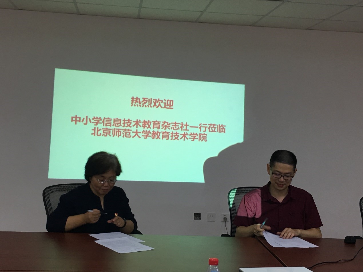 2017年9月7日下午,“中小学信息技术教育杂志社”与教育技术学院蔡苏老师的合作签署仪式及交流会在我院举行。教育技术学院董艳副院长、傅骞副院长和蔡苏老师,以及中小学信息技术教育杂志社社长祁靖一、社长助理仲玉维等杂志社核心骨干8人共同出席了会议。